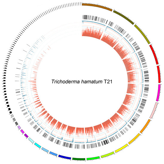 Genome feature of T. hamatum T21. The outermost circle is the contigs. The bar charts from outside to inside in turn show secreted proteins (orange), the density of repetitive sequence (blue), and gene density (dark red).