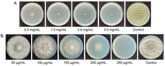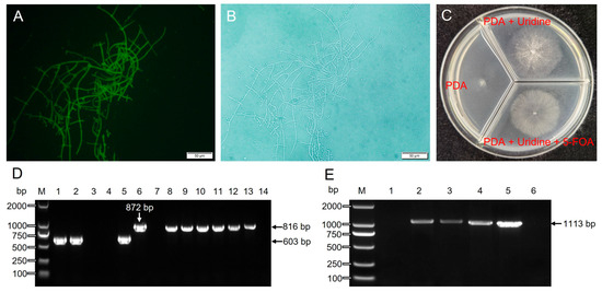 The Thpyr4 and Thpks1 transformants were picked with toothpicks and placed into PDA Petri dishes with corresponding antibiotics. Pick the mycelium of transformants onto a slide and observe the green fluorescence under a fluorescence microscope (Olympus IX53, Tokyo, Japan). Then, Thpyr4 and Thpks1 transformants were collected after 15–20 h of incubation at 28 °C and 200 rpm for extraction of the genomic DNA. Positive transformants were identified by PCR, and the information on primers is listed in Table S1.