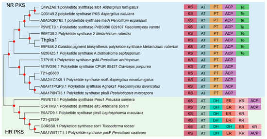 Phylogenetic analysis of the PKS domain. Branch nodes with greater than 70% support from 1000 bootstrapped pseudo-replicates are indicated with red dots in the phylogenetic tree. NR-PKS indicates nonreducing PKS, and HR-PKS indicates highly reducing PKS. KS, ketosynthase domain; AT, acyltransferase domain; PT, product template domain; DH, dehydratase domain; ER, enoylreductase domain; KR, β-ketoacylreductase domain; ACP, acyl carrier protein; Te, thioesterase.