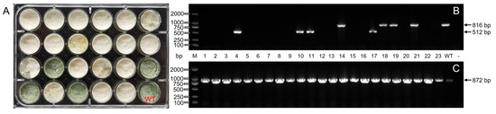 After screening by G418, 242 transformants were acquired, 175 of which had green fluorescence observed under the fluorescence microscope. All the transformants with green fluorescence were transferred to 24-well cell plates for phenotypic observations and molecular identification. Results are presented in Figure 7. Thpks1-f/Thpks1-r amplified an 816 bp (lanes 14, 18, 19, and 21) DNA fragment from the transformer of the green phenotype aligned to T21 wild type. The white phenotype transformers were successfully knocked out of the pigment gene Thpks1, which corresponds to the molecular identification results. Additionally, the Thpks1-f/Thpks1-r amplified a 512 bp (lanes 4, 10, 11, and 17) fragment from knockout mutants (Figure 7B), and sequence alignment of lane 4 and lane 11 indicated that this phenomenon was due to NHEJ between the dual targets (Figure S5B,C). Based on phenotype and molecular identification, 156 transformers were successfully knocked out with Thpks1, of which 27 knockout mutants were due to Cas9 nuclease shearing, and 129 knockout mutants had successful insertion of the GFP at the dual target site (Figure S6). Therefore, the simultaneous transfer of CRISPR/Cas9 plasmids and the homologous recombinant fragment was able to significantly improve the knockdown efficiency by 89.1%.