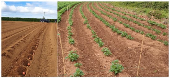 Unplanted furrows at the field periphery were used for manual application of treatments and seeding. Treatment blocks for each of the seven treatments (Table 1) were created measuring 1 m × 4 m, each consisting of two 4 m blocks within a furrow (Figure 1). At 30 cm intervals within each furrow, divots 25 cm deep were created for planting, giving a total of 13 potato plants per furrow and 26 plants per treatment block. At the base of each divot, treatments were applied at the specified rates (Table 1) before being covered with 5 mm of soil from the furrow edge. One seed potato was planted on top of the treatment and the furrow closed over thereafter. Normal farming practice, less the application of pesticides for wireworms, was continued throughout the trial period, inclusive of watering during drought periods experienced in June and July 2022. Trials were commenced in May 2022 and ran through to early September 2022, with the potato plants ‘topped’ in August to harden off the potatoes prior to harvest. Two experimental blocks were created for each treatment, giving a total of 52 potato plants for yield and damage analysis.