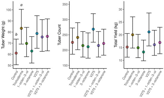 Left-hand panel. Mean weight (g) per potato tuber. Middle panel. Total number of tubers per block (26 plants) during the course of the field trial. Right-hand panel. Total potato yield (kg) per block (26 plants). Values are marginal means and 95% confidence intervals from GLMMs. Letters above given value scores denote significance between treatments (p < 0.05) whereby letters (a–b) represent untreated control (a) and Trichoderma treatment (b).