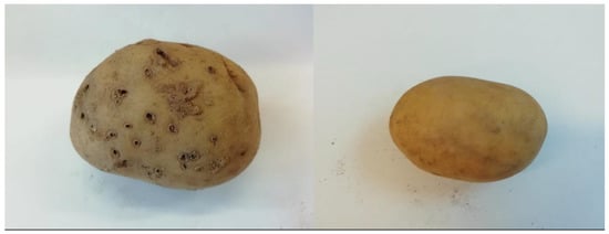 Images showing severity of wireworm damage in harvested potatoes. Left-hand panel shows potato tuber taken from control plot at harvest with multiple wireworm attack holes present on surface of potato. Right-hand panel shows unaffected potato retrieved from M. brunneum and 3-octanone combination treatment plot.