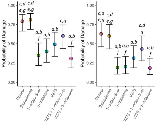 Mean relative wireworm damage scores for potatoes treated with VOCs, Trichoderma, and M. brunneum conidia, or combinations thereof, during early plant growth phases. Scoring was relative to wireworm damage incidence in harvested potatoes (0 = no wireworm damage, 1 = 1 wireworm attack/hole, 2 = multiple wireworm attacks/holes). Left-hand panel. No damage [score 0] vs. damage (1,2). Right-hand panel. No damage or light damage (0,1) vs. severe damage (2). Values are marginal means and 95% confidence intervals from GLMMs. Letters above given values denote significance between treatments (p < 0.05), whereby letters (a–g) represent each treatment reading sequentially from left to right.