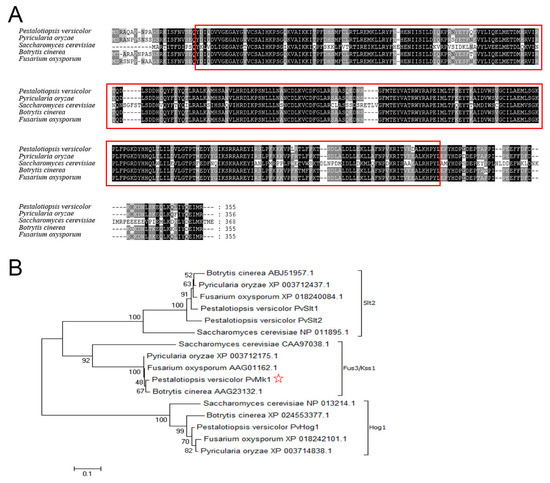 Characterization of the PvMk1 protein in P. versicolor. (A) Alignment analysis of the amino acid sequences of PvMk1 and its homologs from other fungi using the DNAMAN program. Red circled represents the typical S-TKc domain sequences. Kss1: S. cerevisiae (CAA97038.1); PMK1: M. oryzae (XP_003712175.1); BMP1: B. cinerea (AAG23132.1); FMK1: F. oxysporum (AAG01162.1); (B) Phylogenetic analysis of four MAPKs in P. versicolor and their homologs from other fungi. Red star marked is the PvMk1 protein in this study. The amino acid sequences were analyzed using MEGA 7.0 and an unrooted neighbor-joining algorithm. Bootstrap values were calculated from 1000 bootstrap replicates. Only bootstrap support values >50% are shown.