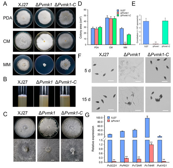 To explore the role of PvMk1 in fungal growth and the development of P. versicolor, the differences in colony morphology, vegetative growth, and conidiation among the wild-type strain XJ27, the ΔPvmk1 mutant, and the complemented strain ΔPvmk1-C were characterized by culturing independently on PDA, CM, and MM media for 5 d. On the PDA and CM plates, there was no significant difference in the colony diameter of the ΔPvmk1 mutants compared with the wild-type XJ27 and the complemented strain ΔPvmk1-C. The main difference is that the ΔPvmk1 mutant colony surface turned white and the aerial hyphae development was significantly decreased. Interestingly, on MM medium, the ΔPvmk1 mutants were basically unable to grow (Figure 2A,D). The growth defect of ΔPvmk1 regarding its aerial hyphae formation was further confirmed by the phenotype of these three strains grown on PDA medium in the test tubes (Figure 2B). When the incubation time was extended to 15 d, the ΔPvmk1 mutant had some growth on MM medium, but compared to wild-type and complemented strains, the aerial hypha development of the mutant was severely impaired (Figure 2C). These results indicate that PvMk1 is implicated in the regulation of aerial hyphal development in P. versicolor.