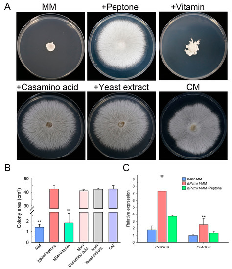 The above observation that ΔPvmk1 mutants failed to grow on MM medium when compared to the colony diameter of the wild-type strain on the complete medium (CM) prompted us to hypothesize that the mutants might be defective in their tolerance to the relative nutrient-depleting conditions and to some of the key nutrient elements in the CM, but not in MM, that might be essential for the ΔPvmk1 mutant growth. To test this idea, we compared the nutrient elements of CM and MM and found that peptone, casamino acid, yeast extract, and amino acid solution from CM are absent in MM. We therefore added these elements into MM independently and tested the growth of the ΔPvmk1 mutants on these supplemented MM plates. Interestingly, we found that MM plates added with peptone, yeast extract, or casamino acid all restored the growth of ΔPvmk1 mutants to the level on CM plates, whereas the addition of amino acid solution only partially increased the growth of ΔPvmk1 mutants (Figure 3A,B). Since peptone and yeast extract are the main type of nitrogen nutrient in CM plates, these results suggest that the ΔPvmk1 mutants cannot grow normally on the MM medium without a sufficient nitrogen nutrient supply. Thus, the ΔPvmk1 mutants might be defective regardingtheir tolerance to nitrogen-starved stress compared to the wild-type strain, which can grow normally on MM even when the colony diameter is reduced relative to its growth on CM. Taken together, we conclude that PvMk1 is necessary for P. versicolor to tolerate and grow under nitrogen-starved conditions.