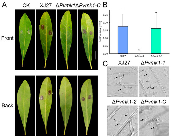 Virulence assays of the ΔPvmk1 mutant on bayberry leaves. (A) Leaves of Chinese bayberry (Cultivar ‘Zaojia’) were inoculated with the wild-type XJ27, the ΔPvmk1 mutant and the complemented strain ΔPvmk1-C. Photographs of disease symptoms were taken 3 d after inoculation. (B) Calculation of lesion areas on Chinese bayberry leaves caused by different strains. Lesion area data were analyzed using Image J. Asterisks indicate statistically significant differences at ** p = 0.01 according to Duncan’s range test. Bar = 1 cm. (C) Conidia germination and infection structure differentiation of the XJ27, ΔPvmk1, and ΔPvmk1-C strains incubated on onion epidermal cells for 24 h. The arrow represents the point of invasion. Bars = 50 μm.