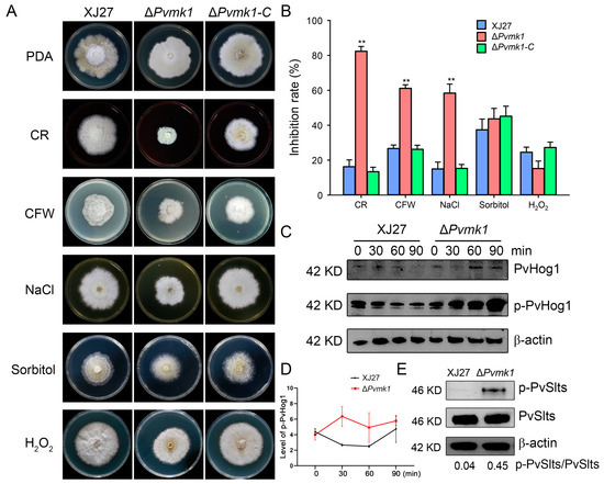 Assays of the response of the ΔPvmk1 mutant to cell wall integrity, hyperosmotic and oxidative stresses. (A) Colony morphology of different strains inoculated on PDA plates supplemented with the cell-wall-perturbing agent CR (100 μg/mL), CFW (300 μg/mL), osmotic stress agent NaCl (0.5 M), Sorbitol (2 M), and the oxidative stress agent H2O2 (20 mM). Colony photographs were taken at 6 DPI (days post-inoculation). (B) The growth inhibition rate of the XJ27, ΔPvmk1, and ΔPvmk1-C strains was calculated relative to their growth rate with untreated conditions. The data were analyzed using a GraphPad Prism 7.0 and an unpaired two-tailed Student’s t-test. Asterisks indicate statistically significant differences at ** p = 0.01. All experiments were repeated three times. (C) Assays of the phosphorylation level of PvHog1 in XJ27 and the ΔPvmk1 mutant after they were induced were performed by adding 0.5 M of NaCl at 0, 30, 60, and 90 min. The control was the protein content of β-actin. (D) The relative phosphorylated level of PvHog1 in XJ27 and the ΔPvmk1 mutant. Values were the ratio of phosphorylated PvHog1 to non-phosphorylated PvHog1 in indicated strains and time points. (E) Determination of the phosphorylation level of PvSlts (PvSlt1 or PvSlt2) in XJ27 and the ΔPvmk1 mutant cultured in CM with CFW stress treatment for 30 min.