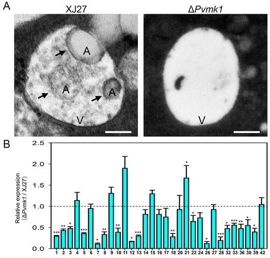 Assay of autophagosome formation and autophagy gene expression in the ΔPvmk1 mutant. (A) Observation of autophagosome formation in XJ27 and the ΔPvmk1 mutant using transmission electron microscopy (TEM). V represents vacuole, A represents autophagosome, indicated by arrows. Bar = 0.5 μm. (B) Global expression changes in 31 autophagy genes (ATGs) encoded by the P. versicolor genome. The expression level of P. versicolor β-tubulin gene was used to normalize different samples. The relative expression levels of each ATG gene in XJ27 was set as level 1. Bars represent means and standard deviations of gene expression levels in the ΔPvmk1 mutant compared to those in the wild-type XJ27 strain. All assays were performed in three replications. Significant differences between replicates were statistically evaluated using SDs and one-way ANOVA in SPSS. Asterisks indicate statistical differences between the wild type and the ΔPvmk1 mutant (* p < 0.05, ** p < 0.01, *** p < 0.001).