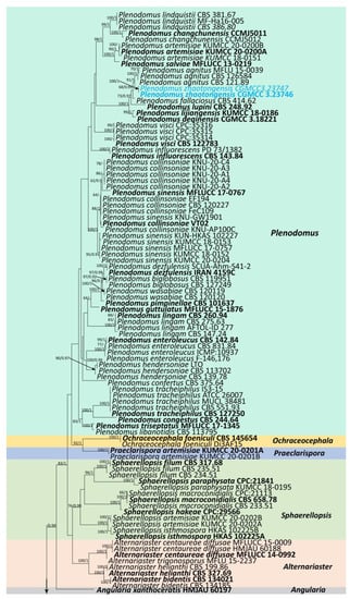 - Hongsanan, S.; Hyde, K.D.; Phookamsak, R.; Wanasinghe, D.N.; Mckenzie, E.H.C.; Sarma, V.V.; Boonmee, S.; Lücking, R.; Bhat, D.J.; Liu, N.G.; et al. Refined families of Dothideomycetes: Dothideomycetidae and Pleosporomycetidae. Mycosphere 2020, 11, 1553–2107. [Google Scholar] [CrossRef]