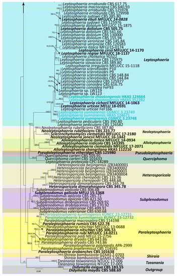Leptosphaeria and Paraleptosphaeria are morphologically similar, but phylogenetic analysis can clearly distinguish them [,,,,]. The same applies to Plenodomus, and the other six genera, viz. Alloleptosphaeria, Alternariaster, Neoleptosphaeria, Pseudoleptosphaeria, Sphaerellopsis, and Subplenodomus, that were re-circumscribed based on molecular phylogeny []. Based on the multilocus phylogeny of the combined LSU, SSU, and ITS datasets, seven other genera, viz. Angularia, Chaetoplea [], Ochraceocephala [], Praeclarispora [], Heterosporicola, Querciphoma, and Sclerenchymomyces [], have been described in Leptosphaeriaceae. The Index Fungorum [] listed 1682 Leptosphaeria species (accessed on 29 March 2023) epithets, and many of them have been synonymised under other genera. The members of Paraleptosphaeria have been reported as saprobic, fungicolous, or pathogenic [,,], and nine species epithets are listed in the Index Fungorum [] (accessed on 29 March 2023). In addition, Plenodomus has often been reported as saprobic or pathogenic on Asteraceae, Fabaceae, Lamiaceae, Liliaceae, and Poaceae [,,,,] and 101 records are listed in the Index Fungorum [] (accessed on 29 March 2023).