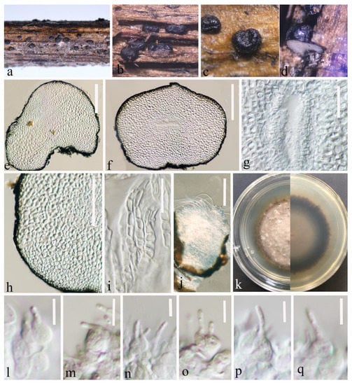 Leptosphaeria yunnanensis (HKAS 124670 holotype). (a–d) Black conidiomata on the host surface. (e,f) Vertical sections of conidiomata. (g) Conidia location in conidiomata. (h,i) Peridium. (j) Germinating conidiomata. (k) Front and reverse of colony on PDA. (l–q) Conidiogenous cells and developing conidia in conidiomata. Scale bars: (e,f) = 150 μm. (g) = 50 μm. (h) = 100 μm. (i) = 50 μm. (j) = 100 μm. (l–q) = 5 μm.