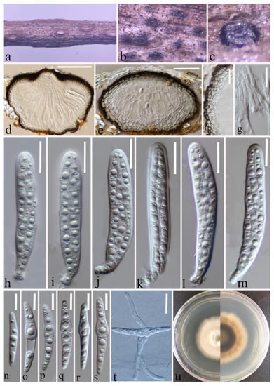 Paraleptosphaeria kunmingensis (HKAS 124662 holotype). (a–c) Ascomata on decaying stalk of herbaceous plant. (d,e) Vertical section of the ascoma. (f) Peridium. (g) Hamathecium. (h–m) Asci. (n–s) Ascospores. (t) Germinating ascospore. (u) Front and reverse colony on PDA. Scale bars: (d) = 100 μm, (e) = 50 μm, (f) = 30 μm, (g–m) = 10 μm, (n–s) = 10 μm, (t) = 20 μm.
