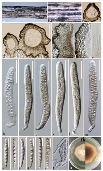 - Thambugala, K.M.; Wanasinghe, D.N.; Phillips, A.J.L.; Camporesi, E.; Bulgakov, T.S.; Phukhamsakda, C.; Ariyawansa, H.A.; Goonasekara, I.D.; Phookamsak, R.; Dissanayake, A.; et al. Mycosphere notes 1-50: Grass (Poaceae) inhabiting Dothideomycetes. Mycosphere 2017, 8, 697–796. [Google Scholar] [CrossRef]