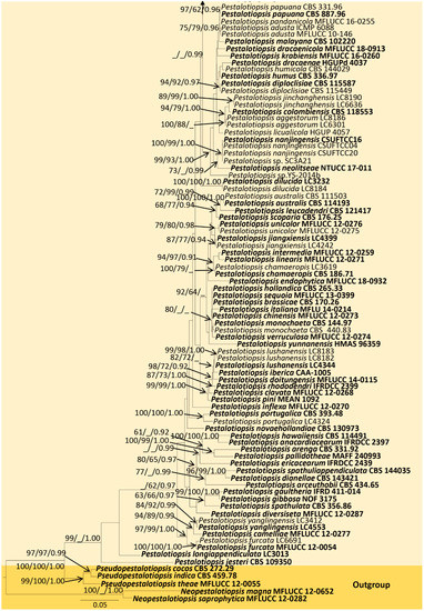 Maximum-likelihood consensus tree inferred by RAxML analysis of combined ITS, tub2, and tef1-a sequence data for Pestalotiopsis. Bootstrap support values for ML ≥ 60%, MP ≥ 60%, and PP ≥ 0.90 are given at the nodes (ML/MP/PP). The tree is rooted in Neopestalotiopsis magna (MFLUCC 12-0652) and N. saprophytica (MFLUCC 12-0282). Type and ex-type strains are shown in bold, and newly identified strain is in red.