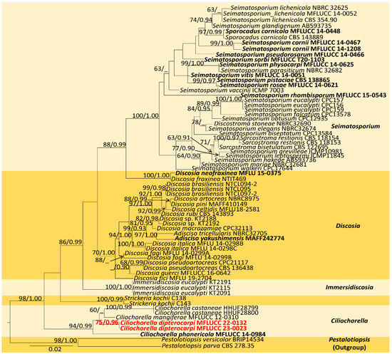 - Tangthirasunun, N.; Silar, P.; Bhat, D.J.; Maharachchikumbura, S.S.N.; Wijayawardene, N.N.; Bahkali, A.H.; Hyde, K.D. Morphology and phylogeny of two appendaged genera of coelomycetes: Ciliochorella and Discosia. Sydowia 2015, 67, 217–226. [Google Scholar] [CrossRef]