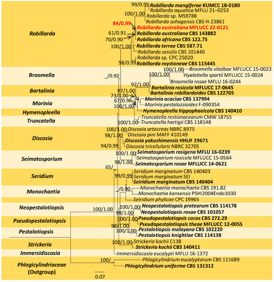 The combined sequence alignment (ITS, LSU, rpb2, and tef1-α) of Robillarda comprised 45 taxa, including Phlogicylindrium eucalyptorum (CBS 111689) and P. uniforme (CBS 131312) as the outgroup taxa. The matrix had 1482 distinct alignment patterns with 44.64% undetermined characters or gaps. The ML analysis of the combined dataset yielded a best-scoring tree with a final ML optimization likelihood value of −26214.966097. The estimated base frequencies were as follows: A = 0.250239, C = 0.240486, G = 0.252222, and T = 0.257053; substitution rates, AC = 1.409959, AG = 3.149767, AT = 1.321223, CG = 1.040419, CT = 5.807309, and GT = 1.000000; gamma distribution shape parameter α = 0.244419; and tree length = 3.825788. In the Bayesian analysis, the average standard deviation of split frequencies at the end of 3,000,000 MCMC generations was calculated with a stop value of 0.009951. The ML and BI trees were similar in topology. The resulting phylogenetic tree from the concatenated alignment grouped the isolate MFLUCC 22-0121 with the ex-type strain R. australiana (CBS 143882) and formed a well-supported clade with strong statistical support (84% ML, 0.99 PP) (Figure 3).