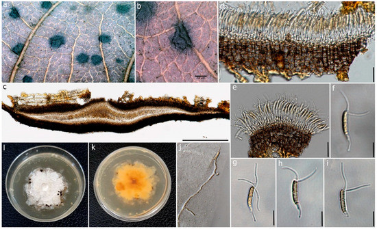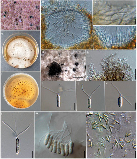 - Tanaka, K.; Endo, M.; Hirayama, K.; Okane, I.; Hosoya, T.; Sato, T. Phylogeny of Discosia and Seimatosporium, and introduction of Adisciso and Immersidiscosia genera nova. Pers. Mol. Phylogeny Evol. Fungi 2011, 26, 85–98. [Google Scholar] [CrossRef]