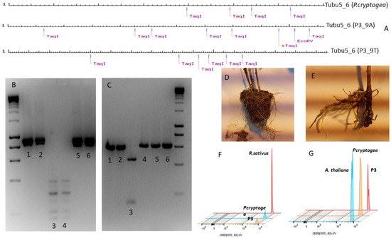 Visual comparisons between PCR-RFLP, Flow Cytometry and pathogenicity assays. (A) NEB cutter analysis. Differences in the banding pattern among P. cryptogea, and two different P3 cloning Tubulin PCR products (9A and 9T) when applying Taq I and EcoRV restriction enzymes. (B) PCR-RFLP assay ITS PCR products: (1) P. cryptogea PCR product, (2) P3 PCR product, (3) P. cryptogea PCR product with TaqI, (4) P3 PCR product with TaqI, (5) P. cryptogea PCR product with EcoRV, (6) P3 PCR product with EcoRV. (C) PCR-RFLP assay COXII PCR products: (1) P. cryptogea PCR product, (2) P3 PCR product, (3) P. cryptogea PCR product with TaqI, (4) P3 PCR product with TaqI, (5) P. cryptogea PCR product with EcoRV, (6) P3 PCR product with EcoRV. (D) Root system in a uninoculated control E. globulus plant. (E) Root system in inoculated plant with P3. (F) PI fluorescence histograms comparing the DNA peaks in radish, P. cryptogea and P3. (G) PI fluorescence histograms comparing the DNA peaks in A. thaliana, P. cryptogea and P3. In the histograms the x-axis represents the fluorescence intensity, and the y-axis represents the number of nuclei (counts), (488) (695/400-W: information representing the laser and filter used for the run.