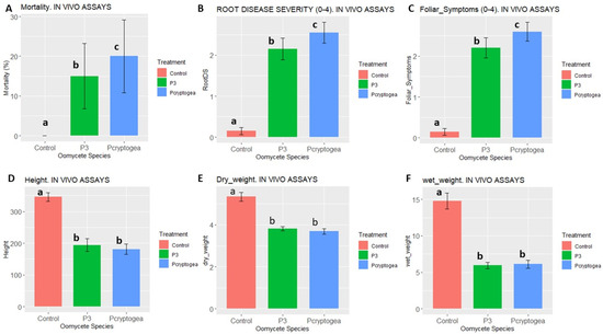 Pathogenicity indices of Eucalyptus globulus plants inoculated with P3 (P. x cryptogea-related Hybrid) and P. cryptogea E2 in comparison with controls. (A) Mortality (% of dead plants), (B) Root Disease Severity Index, and (C) Foliar Symptoms. (D) Plants Height (mm); (E) Plants Dry Weight (g); (F) Plants Wet Weight. Different letters above the bars indicate significant differences.