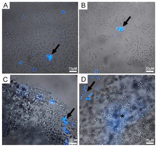 Infection assay of Pb18 fungi in A549 cells cultivated in 2D monolayers and 3D alginate scaffolds. (A,B) A549 cells in 2D monolayers infected with Pb18 yeast cells. (C,D) A549 cells seeded in 3D alginate scaffolds infected with Pb18 yeast cells. Yeast cells (arrows) were previously stained in blue with CFW and were more abundant in the 3D culture. The culture medium was supplemented with a mix of ECM proteins. Note the blurred area (*); this is the internalized fungi on the scaffold, which, being tridimensional, creates this blurred area in blue, due to the staining with CFW.