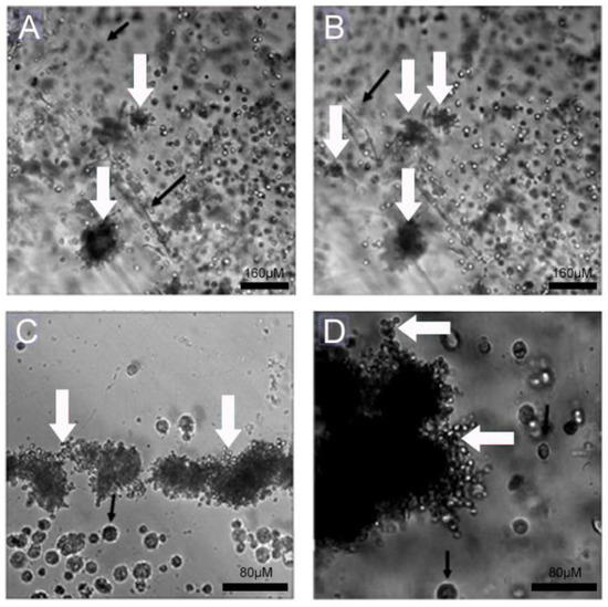 Infection assay of Pb18 fungi in A549 cells cultivated in 3D alginate scaffolds with and without ECM proteins. (A,B) A549 cells seeded in 3D alginate scaffold, infected with Pb18 strain, without addition of ECM proteins. (C,D) A549 cells seeded in 3D alginate scaffold, infected with Pb18 strain, in the presence of ECM proteins. Budding yeasts, typical of daughter cells generated from only mother cells, can be seen (white arrows); some are in close contact to A549 cells (black arrows).