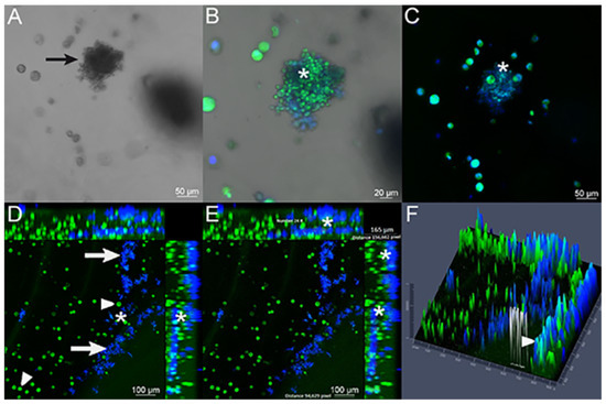 Infection assay verified with confocal microscopy of 3D alginate scaffold infected with the Pb18 strain. (A) Bright field image showing budding yeasts (arrow) in association with A549 lung cells. (B,C) Merged images of FITC-labeled A549 cells (green) and CFW-labeled Pb18 yeasts (blue) inside the 3D alginate scaffold. It is possible to observe the presence of yeast cells in close contact to A549 cells (*). (D) A549 cells (arrowhead) and yeasts (arrow). There is an elevated number of yeasts inside the scaffold, and it is possible to confirm the proximity between A549 host cells and fungal cells (*). (E) Presence of the overlap between blue and green colors (*), showing the contact between the yeasts and lung cells, analyzed in 24 points. The analyzed field thickness was 165 μm, obtained using the ZenBlue software. (F) A 2.5-dimensional image generated using the Zen Blue software. This result demonstrates a graphical representation (this time using height and depth) of the previous images, showing different height peaks for the colors green and blue, individually. The height measurements of the colors can elucidate where the cells and yeasts are located (an upper or lower section). The arrowhead shows the combination of green and blue colors, in the same height/depth, resulting from the proximity between the yeasts (that were plated outside the three-dimensional model) and the cells that were plated inside the 3D model.