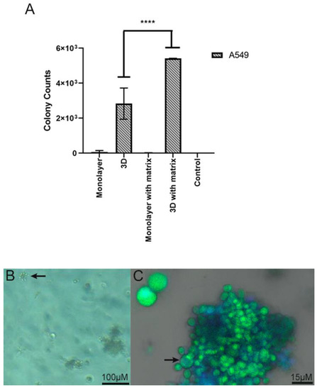 - Carterson, A.J.; Höner zu Bentrup, K.; Ott, C.M.; Clarke, M.S.; Pierson, D.L.; Vanderburg, C.R.; Buchanan, K.L.; Nickerson, C.A.; Schurr, M.J. A549 Lung Epithelial Cells Grown as Three-Dimensional Aggregates: Alternative Tissue Culture Model for Pseudomonas aeruginosa Pathogenesis. Infect. Immun. 2005, 73, 1129–1140. [Google Scholar] [CrossRef]