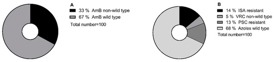Pie chart illustrating the percentage of (A) AmB-wildtype/non-wildtype; (B) ISA- and PSC-resistant/-susceptible; and VRC-wildtype/non-wildtype isolates, according to the clinical breakpoint and Epidemiological cutoff values defined by EUCAST (https://www.eucast.org/mic_and_zone_distributions_and_ecoffs, (accessed on 18 January 2022); https://www.eucast.org/astoffungi/clinicalbreakpointsforantifungals, (accessed on 18 January 2022). PSC; posaconazole, VRC; voriconazole, ISA; isavuconazole, AmB; amphotericin B.