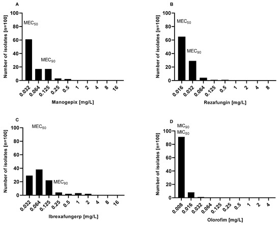 Distribution of minimum inhibitory concentrations (MICs) and minimum effective concentrations (MECs) of (A) manogepix, (B) rezafungin, (C) ibrexafungerp, and (D) olorofim against Aspergillus section Terrei (n = 100).