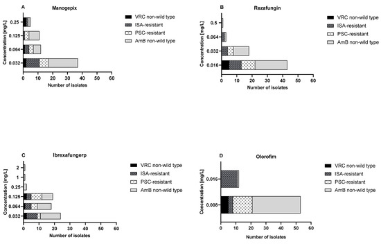 The activity of the tested antifungals, (A) manogepix, (B) rezafungin, (C) ibrexafungerp, and (D) olorofim, with a focus on AmB-non-wildtype (n = 33), ISA-resistant (n = 14), PSC-resistant (n = 13), and VRC-non-wildtype (n = 5) isolates of Aspergillus section Terrei. PSC; posaconazole, VRC; voriconazole, ISA; isavuconazole, AmB; amphotericin B.