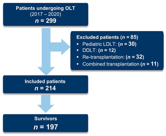All OLT recipients between January 2017 and December 2020 at the Medical University Innsbruck, Austria, were assessed for eligibility. We included patients older than 18 years who received OLT. Exclusion criteria were combined liver−kidney transplantation, living donor liver recipients, re-transplantations (after more than 90 days after the initial transplantation), and multivisceral transplantations. In the case of liver re-transplantation within 90 days after the first organ transplantation, only data from the first operation were analyzed.