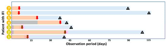 Flow of patients with IFI. Legend: Beginning of prophylaxis (red line), no prophylaxis (gray line), treatment (blue line), moment of IFI diagnosis (red arrow), death (black triangle). Abbreviations: IFI: invasive fungal infection.