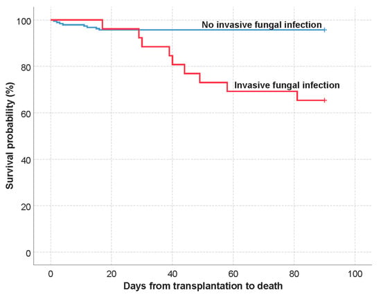 Kaplan–Meier mean survival estimate: analysis of the invasive fungal infection presence (90-day mortality).