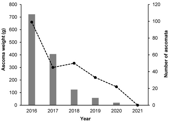 Number and weight of ascomata collected in the study site (2016–2021). Columns and black circles indicate the weight and the number of ascomata, respectively.