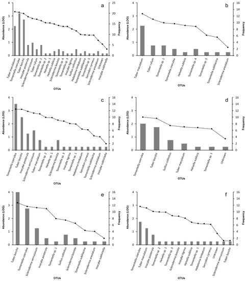 - Taschen, E.; Sauve, M.; Taudiere, A.; Parlade, J.; Selosse, M.A.; Richard, F. Whose Truffle Is This? Distribution Patterns of Ectomycorrhizal Fungal Diversity in Tuber melanosporum Brûlés Developed in Multi-host Mediterranean Plant Communities. Environ. Microbiol. 2015, 17, 2747–2761. [Google Scholar] [CrossRef] [PubMed]