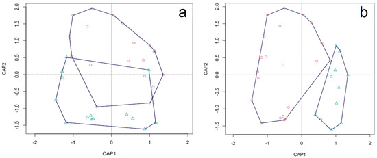 - Anderson, M.J.; Willis, T.J. Canonical Analysis of Principal Coordinates: A Useful Method of Constrained Ordination for Ecology. Ecology 2003, 84, 511–525. [Google Scholar] [CrossRef]