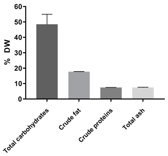 The proximate composition of the freeze-dried A. heimuer extract included approximately 50% soluble carbohydrates measured using the anthrone method, 17.7% crude fat, 7.4% proteins calculated using total nitrogen measured using the method of Kjeldahl with the conversion factor of 4.16 as recommended for fungi [25], and 7.4% ash (Figure 1). According to the published data, the composition of Auricularia strongly depends on the species, but carbohydrates are always the major compound [1,2].