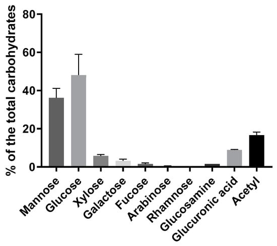 Acid hydrolysis with sulfuric acid, according to Sluiter et al. [19], followed by high-performance anion exchange chromatography coupled with pulsed amperometric detection (HPAE-PAD) was used to estimate glucose, mannose, glucuronic acid, xylose, galactose, rhamnose and arabinose. In short, a Dionex ICS-5000 ion chromatography system (Thermo Fisher Scientific, Waltham, MA) equipped with a CarboPac-PA20 guard column (3 × 30 mm) and a CarboPac-PA20 analytical column (3 × 150 mm) was used. An integrated pulsed amperometric detection (IPAD) with a gold working electrode and an Ag/AgCl reference electrode was applied. A standard carbohydrate quadruple potential waveform was used. The gold electrode was regularly maintained. Integration was performed using a Dionex Chromeleon 7.2 SR5 chromatography data system (ThermoFisher Scientific, Waltham, MA, USA). Elution was carried out with sodium hydroxide at a flow rate of 0.6 mL/min. The analyte concentration was calculated using a calibration curve.