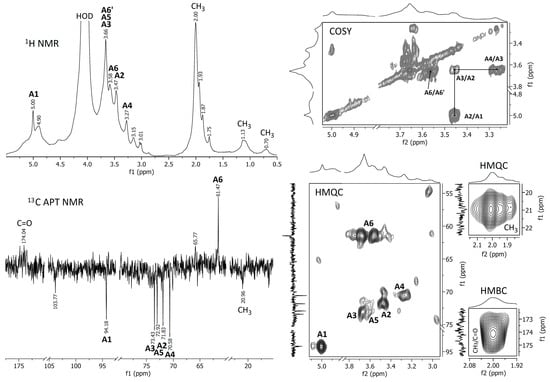 Proton NMR and 13C APT NMR spectra of the crude and deacetylated extracts were recorded on a Bruker Avance III HD 600 MHz (Bruker, Billerica, MA, USA) in D2O and D2O/NaOD solutions at 20 °C. Correlation 1H, 1H COSY, 1H, 13C HMQC and 1H, 13C HMBC NMR experiments were used for signal assignment. The 1D and 2D NMR spectra were processed using MestReNova 10.0 software (Mestrelab Research, Santiago de Compostela, Spain).