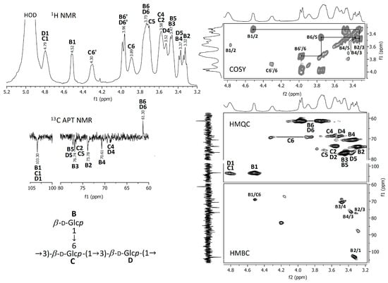 Proton NMR and 13C APT NMR spectra of the crude and NH4OH-treated Auricularia extracts are demonstrated in Figure 4 and Figure 5; the zooms of some 2D NMR spectra (COSY, HMQC and HMBC) are also shown in these figures. A strong proton signal at approximately 2 ppm, together with smaller ones at 1.93, 1.87 and 1.75 ppm and corresponding carbon signals around 21 ppm indicate the O-acetylation of monosaccharide units in the crude extract [35]. This assignment is confirmed by the HMQC signal at 2.0 ppm/21.0 ppm and the HMBC signal at 2.0 ppm/174 ppm, indicating interactions between CH3 protons and CH3 and C=O carbons in O-acetyls, respectively. The proton signals at 5.00, 3.66, 3.58, 3.45 and 3.27 ppm and the carbon signals at 94.18, 73.43, 72.92, 71.83, 70.58 and 61.47 ppm were assigned to 1,3-linked α-D-mannopyranose units (A), which probably compose the backbone of glucuronoxylomannan. Unfortunately, the low resolution of the HMBC spectrum does not permit to assign possible O-acetylation patterns for this carbohydrate unit. The main proton and carbon signals observed for the Auricularia extract after the treatment with NH4OH were assigned to terminal, 1,3,6-linked and 1,3-linked β-D-glucopyranosyl units designed as units B, C and D (Figure 5). These signal confirmed the presence of highly branched (1→3)(1→6)-β-D-glucan having terminal β-D-glucopyranosyls attached to the O-6 position of some 1,3-linked β-D-glucopyranoses in the backbone. Branched β-D-glucan of the same structure has been described earlier for Auricularia mushrooms [55].