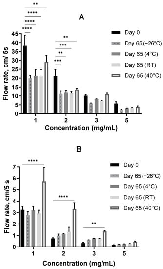 As shown in Figure 6A, the flow rate of the A. heimuer samples decreased with the length of time of storage at different temperatures. At lower concentrations of 1 and 2 mg/mL, the differences were statistically significant, whereas at the higher concentrations of 3 and 5 mg/mL a decreasing tendency was observed.