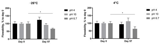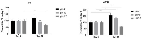Effect of pH values on the flowability of the A. heimuer 5 mg/mL solution after storage at different temperatures (−24 °C, 4 °C, room temperature, and 40 °C). The asterisks represent the significance at Day 0 vs. Day 57: * p < 0.05, ** p < 0.01, *** p < 0.001. Two-way ANOVA followed by Šídák’s multiple comparisons test.