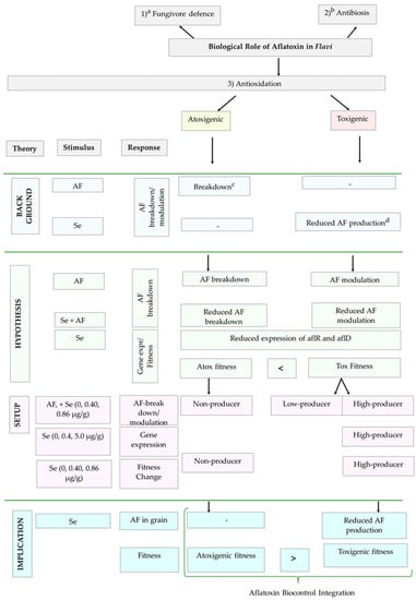 Figure 1. Schematic representation of the investigation of the role of aflatoxin (AF) degradation in an antioxidative mechanism. The scheme includes the background of what is known/presumed on breakdown of AF by atoxigenic Flavi, and reduction in AF production under increased antioxidant Se (selenium) in environment; hypothesis; experimental setup; implication on control of AF. a [17,18]; b [19]; c [33]; and d [20,21,22,23,24].