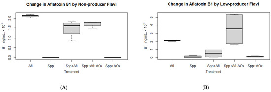 There was no significant change in added B1 (“Afl”) due to exposure to high AF producer strains (“Spp+Afl”) (Table 3). However, the B1 maximum levels produced (“Spp+Afl”: 3169 ng/mL) were modulated to levels closer to the added amount (“Afl”: 2114 ± 68 ng/mL) compared to the maximum levels the species (“Spp”) would produce without extrinsic B1 (“Spp”: 33,749 ng/mL) (Figure 2C). (Modulate implies maintaining the level of the aflatoxin variant to within what the Flavi produces.)