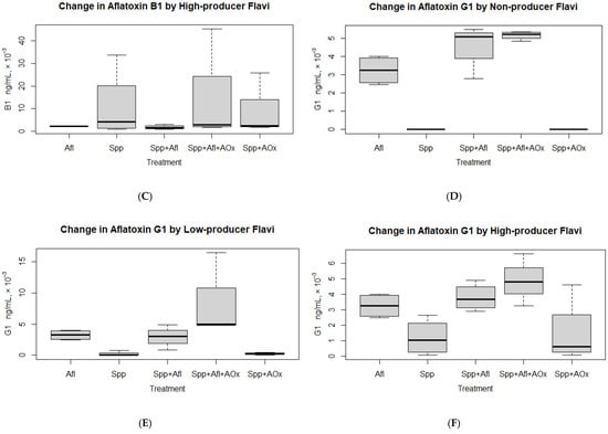 Figure 2. Boxplot showing change in quantity of AFs B1 (AC) and G1 (DF) exposed to toxigenic and atoxigenic Flavi with or without the antioxidant (Se). (A,D) is change in B1 and G1 in none-producers; (B,E) is change in B1 and G1 in low-producers; and (C,F) is change in B1 and G1 in high-producers.