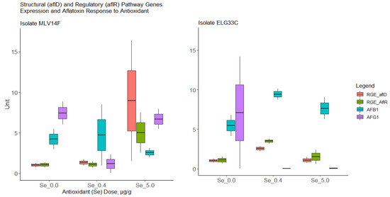 However, the two isolates responded differently to the levels of the antioxidant introduced. Isolate ELG33C showed an upregulation of genes at Se dose 0.4 µg/g and a downregulation at a much higher (8-fold) antioxidant dose. However, the isolate MLV14F upregulated genes at a much higher Se level (8-fold) with no effect at a 0.4 µg/g Se dose. There was no clear correlation between gene expression in the two pathway genes and AF levels. However, it was exceptionally observed that B1 in isolate ELG33C, whose gene upregulation responded to lower Se levels, increased with the upregulation of aflR and aflD and reduced with the downregulation of the two genes.