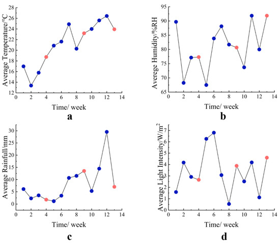 Figure 1. Changes in temperature (a), humidity (b), rainfall (c), and light intensity (d) during the round bamboo deterioration process. Pink dots represent the environmental factors of sample collection time, and blue dots represent the weekly environmental factors during the deterioration process.