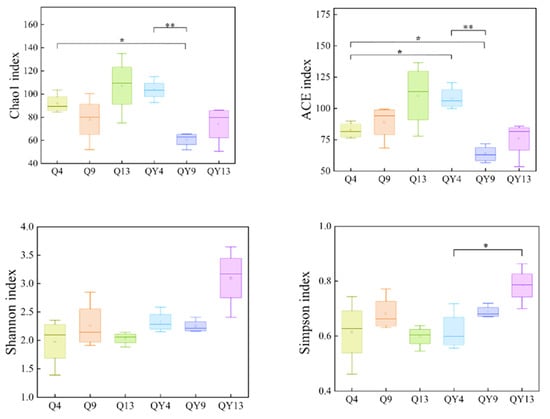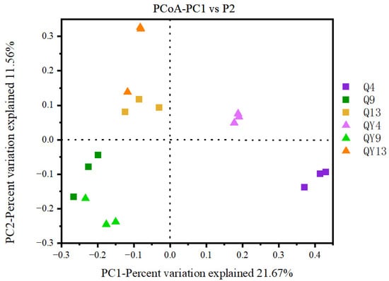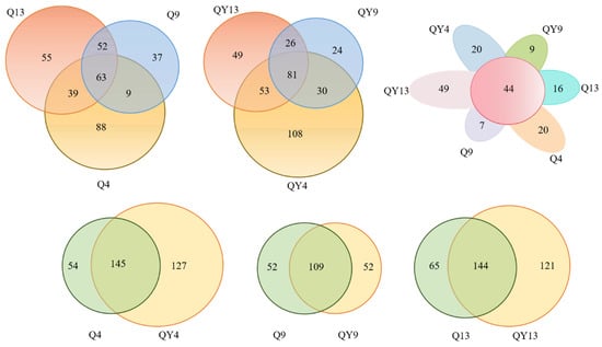 Venn diagrams can intuitively indicate the similarity and overlap among different groups. As can be seen in Figure 3, the Q4, Q9, and Q13 groups contained 63 shared OTUs, as well as 88, 37, and 55 unique OTUs, respectively. Similarly, the QY4, QY9, and QY13 groups contained 81 shared OTUs, as well as 108, 24, and 49 unique OTUs, respectively. The number of overlapping OTUs among all the groups (Q4, Q9, Q13, QY4, QY9, and QY13) was 44. In addition, the overlapping OTUs between Q4 and QY4, Q9 and QY9, Q13 and QY13 were 145, 109, and 144, respectively.